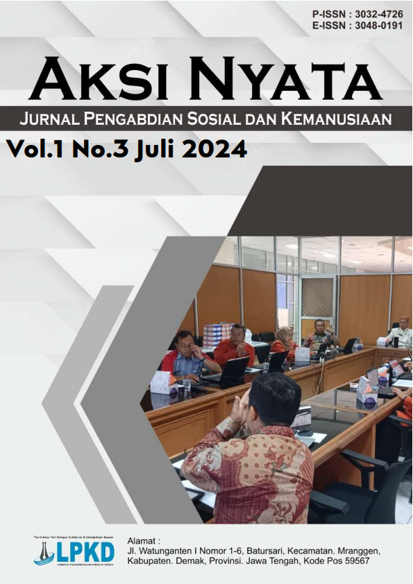 Vol. 2 No. 4 (2025)Aksi Nyata : Jurnal Pengabdian Sosial dan Kemanusiaan adalah jurnal yang menerima artikel dalam bahasa Inggris dan bahasa Indonesia . Print ISSN : 3032-4726, Online ISSN : 3048-0191.Focus dan Scope pada bidang pendidikan, Hukum, Ekonomi, Humaniora, Teknik, Pertanian, Komunikasi, Kesehatan, dan Rekayasa. Aksi Nyata : Jurnal Pengabdian Sosial dan Kemanusiaan memuat publikasi hasil kegiatan pengabdian masyarakat, model atau konsep dan atau implementasinya dalam rangka peningkatan partisipasi masyarakat dalam pembangunan, pemberdayaan masyarakat atau pelaksanaan pengabdian kepada masyarakat. Aksi Nyata : Jurnal Pengabdian Sosial dan Kemanusiaan, terbit 1 tahun 4 kali (Januari, April, Juli dan Oktober)