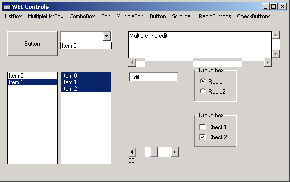 After launching the program, an empty window will be displayed. There are numerous menus in the window, each relating to a different type of control. Each menu has "Create" and "Delete" along with a other options specific to each control. By selecting these menu options, controls will be created and modified as demonstrated in the above illustration.