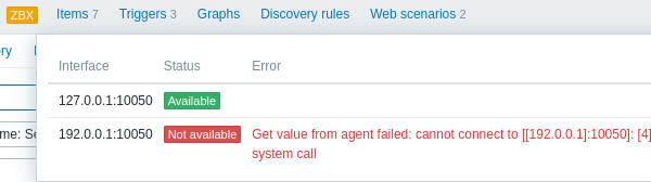 Uma interface de host é tratada como inalcançável após uma verificação com falha (erro de rede, timeout) pelos agentes Zabbix, SNMP, IPMI ou JMX. Desde o Zabbix 6.2.0, as verificações ativas do agent Zabbix também afetam a disponibilidade da interface. Quando as verificações ativas se tornam indisponíveis, elas contribuem para o status geral de disponibilidade da interface do agent.