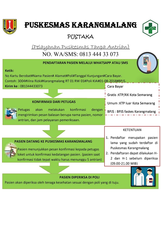 Pendaftaran pasien dengan menggunakan whatsapp/sms melalui nomor telepon yang sudah ditentukan.