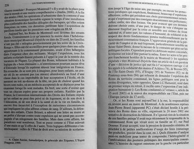 Claire Levy-Vroellant et Jérôme Segal, « les Roms de Montreuil et d'ailleurs - des immigrés européens particuliers », Les Temps Modernes, no 624, 58e année, mai-juillet 2003, p. 223-230page 223, p. 224-25, p. 226-27, p. 228-29, page 230.