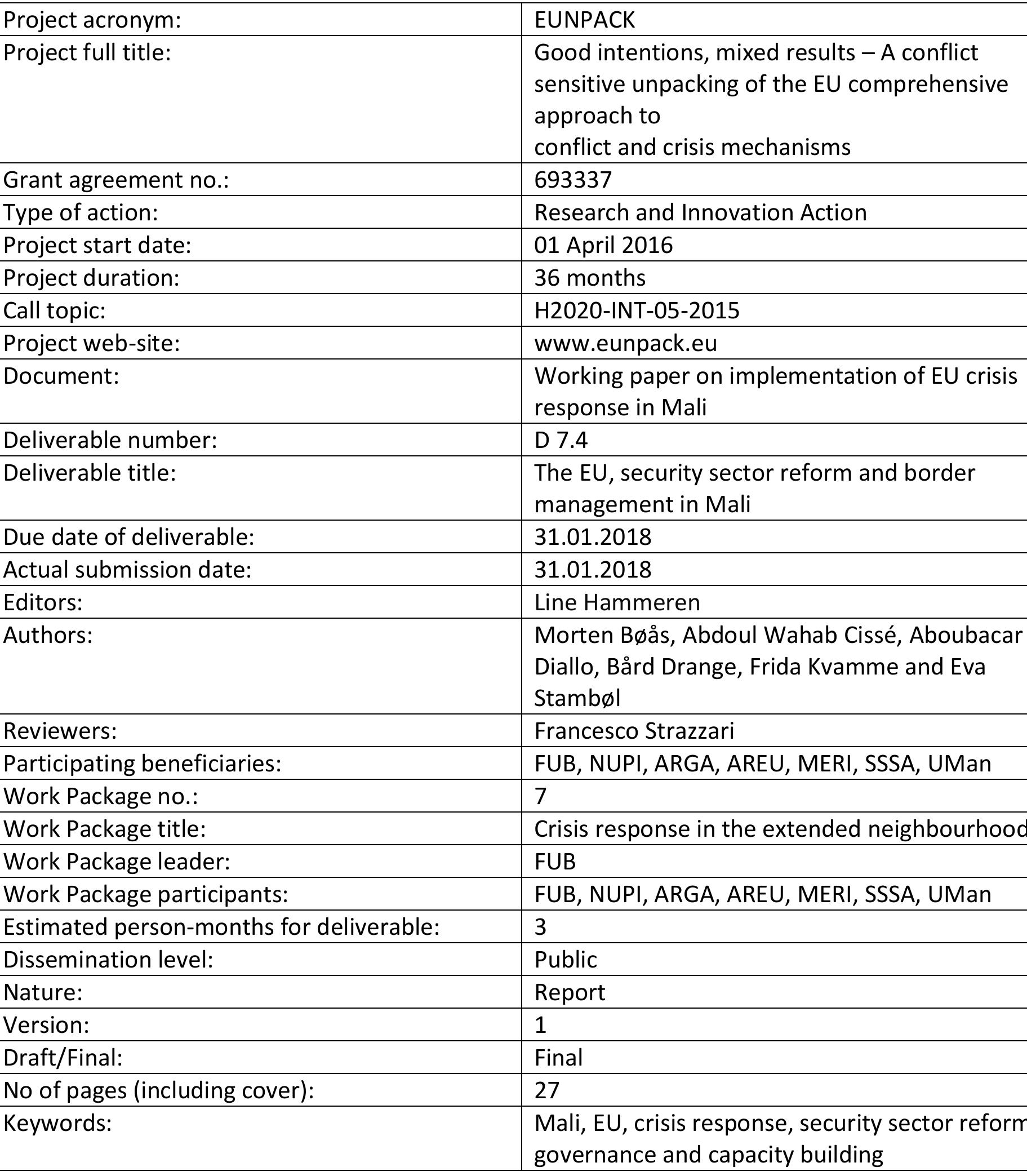 The EU’s concern with the fragile states of Sahel is not new. This became evident already in 2011... more The EU’s concern with the fragile states of Sahel is not new. This became evident already in 2011 through the EU Strategy for Security and Development in the Sahel (EU 2011). The conflict that erupted in Mali in 2012 pushed the issue of the Sahel even higher on the agenda, and the migration crises of 2014/15 made the Sahel a concern of ‘high politics’ for Europe. As a result, the EU and other international stakeholders are increasingly involved on the ground in Mali and several other Sahel countries through Operational Serval and now Barkhane (France), MINUSMA (the United Nations) and the deployment of two EU police and military training missions. It is the latter two missions that constitute the main case studies in this report. They are the EU Capacity Building Mission (EUCAP Sahel Mali) and the EU Training Mission to Mali (EUTM). Despite the efforts of these international interventions, security in Mali is deteriorating, and the conflict has spread to the centre of the country. Central Mali is currently gripped by escalating insecurity, due to an increase in inter-communal conflicts, the proliferation of self-defence groups and non-state actors including violent extremist ‘jihadist’ groups and bandits. Consequently, 2017 has been the most violent year since the French intervention in 2013 (see Ba and Bøås 2017).