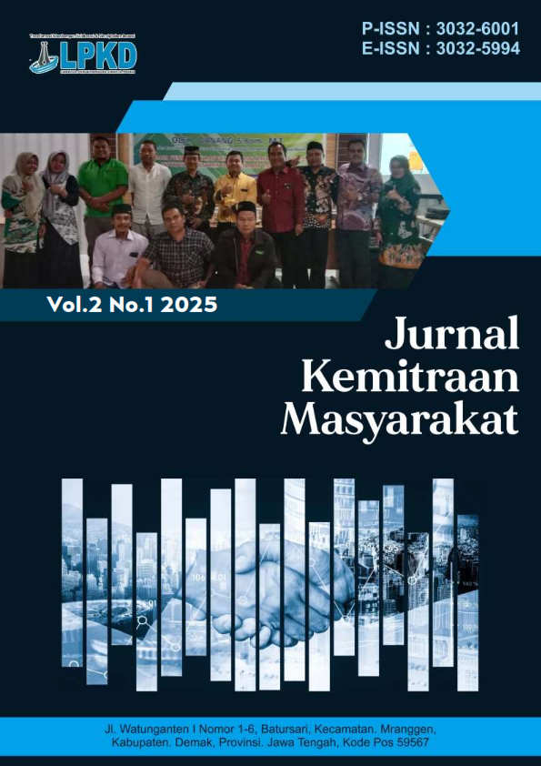 Jurnal Kemitraan Masyarakat adalah jurnal yang menerima artikel dalam bahasa Inggris dan bahasa Indonesia . Print ISSN : 3032-6001, Online ISSN : 3032-5994. Focus dan Scope pada bidang pendidikan, Hukum, Ekonomi, Humaniora, Teknik, Pertanian, Komunikasi, Kesehatan, dan Rekayasa. Jurnal Kemitraan Masyarakat memuat publikasi hasil kegiatan pengabdian masyarakat, model atau konsep dan atau implementasinya dalam rangka peningkatan partisipasi masyarakat dalam pembangunan, pemberdayaan masyarakat atau pelaksanaan pengabdian kepada masyarakat. Jurnal Kemitraan Masyarakat, terbit 1 tahun 4 kali (Maret, Juni, September dan Desember)
