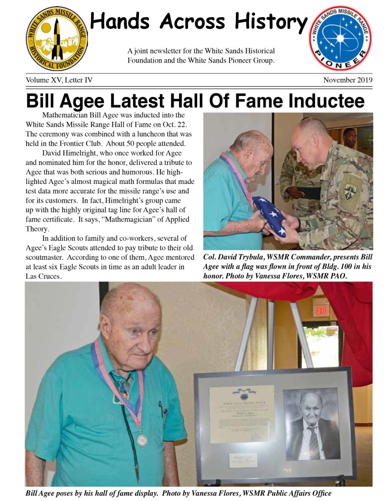 The “Hands Across History” Newsletter is published by the White Sands Missile Range Historical Foundation, a nonprofit organization that aims to preserve the accomplishments of White Sands Missile Range. The newsletter is intended to keep our members informed about current events and share information of common interest. The editor is Jim Eckles. He can be contacted by email at nebraska1950@comcast.net. Membership is open to anyone who shares its goals.